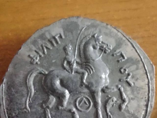 Терас седна върху делфин държи шлем с гребен. От зад слизащ гол конник Монетата е специфична за региона на Тарас- днес Таранто в Италия. Оригиналната монета на Номос е с тегло 7,8-7,9 гр. Тази е с тегло 44,5 гр. Моделът е без аналог и няма свалян калъп не е тиражирано. Направена е от жълт метал с диаметър 42мм. Подходящ е за тиражиране или за плакет както и ...
