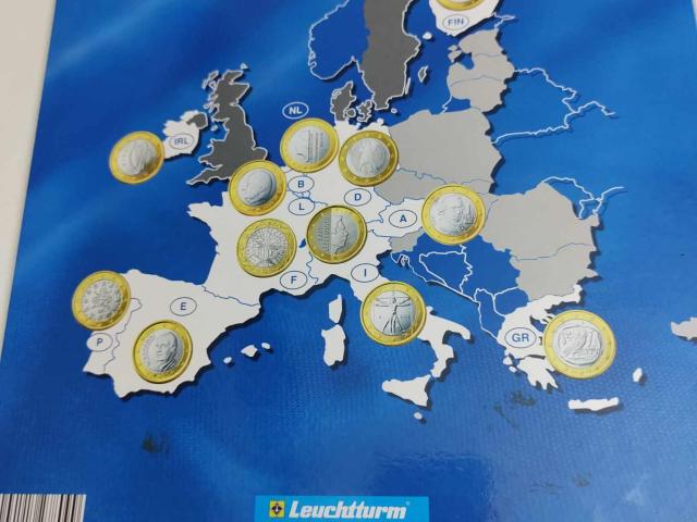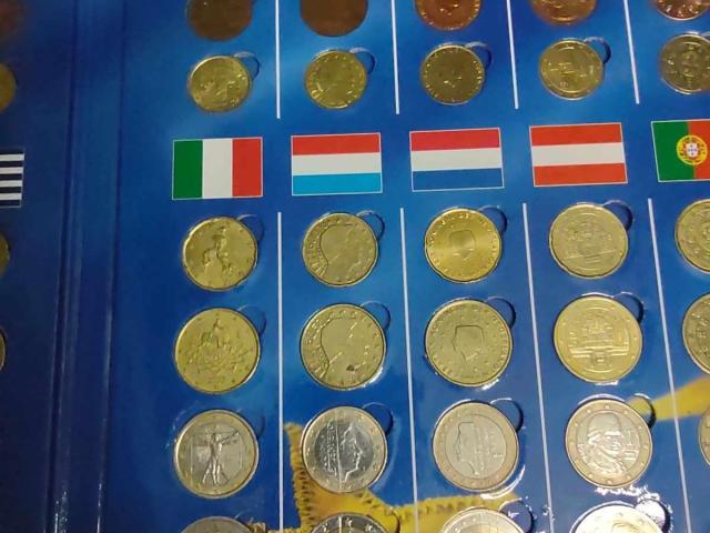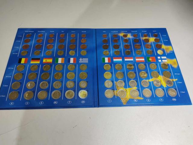 12 сета подредени по държави и нoминали, липсват само две монети.