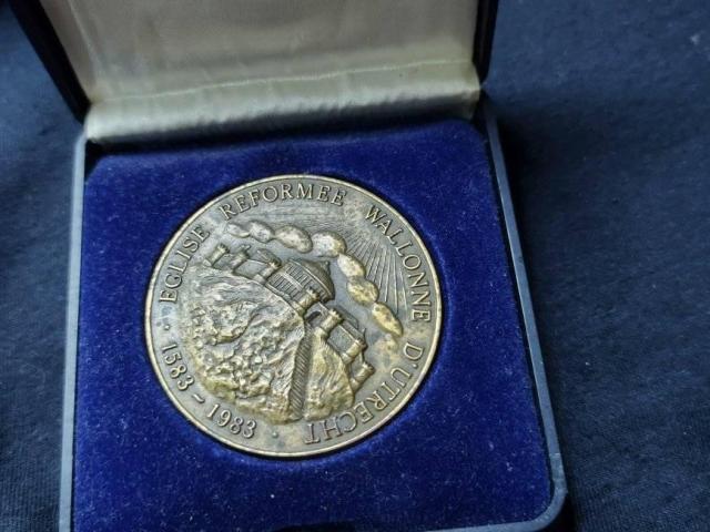 НИДЕРЛАНДИЯ 400-ТА ГОДИШИНА НА ВАЛОНСКАТА ЦЪРКВА В УТРЕХТ 1583-1983 г. Медал Св. ПЕТЪР 50 mm 72 g Бронз. B19 Лице: PETER I TRAIECTEN S CAPLI ECCLICE SCI / Свети Петър, държащ ключове и библия, седнал на готически трон, краката му са подпряни на крал, лежащ по гръб. Реверс: 1583 – 1983 ECLISE REFORMEE WALLONNE D’UTRECHT / Църква, заобиколена от стена с кули, разположена върху скалиста могила със стъпала, облаци отгоре, сияещи лъчи отгоре. Артикулъ...