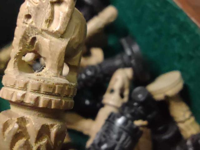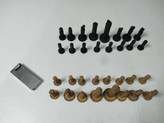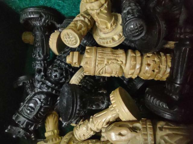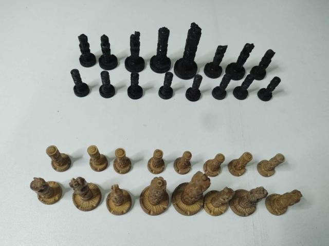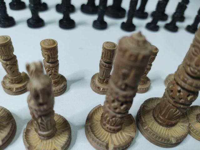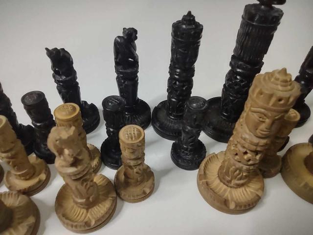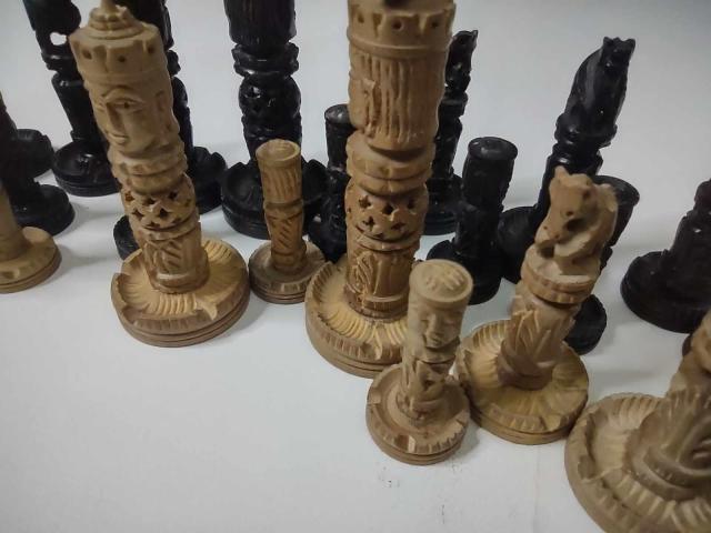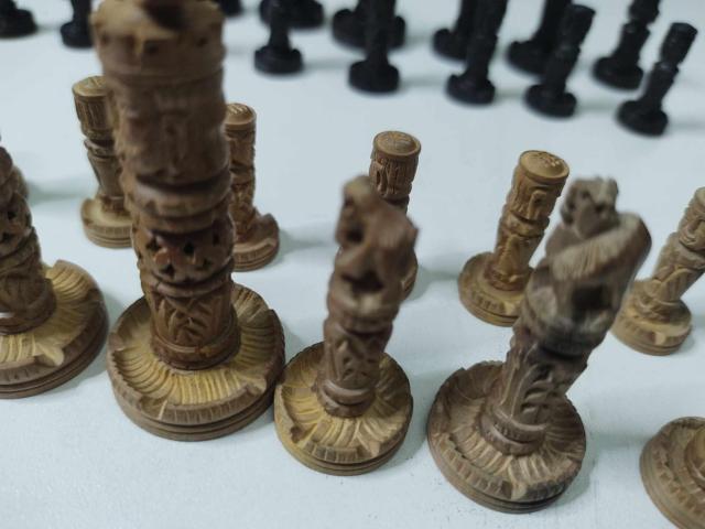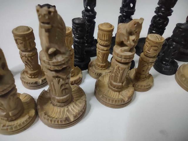 Уникалени ръчно направени дървени фигури на шах от Индонезия. Фигурките са много прицизно изработени изцяло на ръка и много добре изглеждат. Майсторска изработка от остров Бали. 32бр. малки фигурки за шах без наранявания в много добро състояния и изработка Предлагат се без дъска в кутия от пури. Цена 120лв.