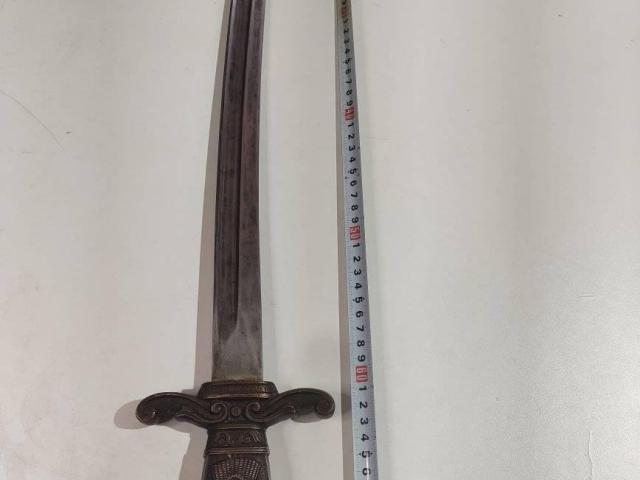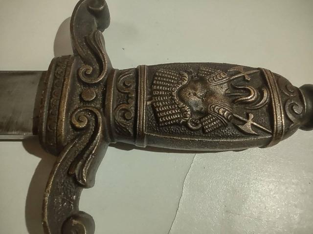 Мечът е създаден от американския кадетски орден- къс меч със здрава в стил байонет Yatagan и острие, изрязано от двете страни с широк връх по цялата дължина. Тежка лята месингова дръжка е здраво закрепена и носи мек бронзов цвят. Сложни детайли, излети във всички части на дръжката и напречния предпазител. С изображението на броня и кръстосани алебарди- масонски символика. Лот:7а Този меч е създад...