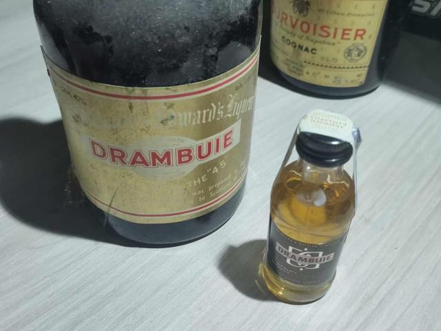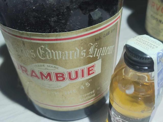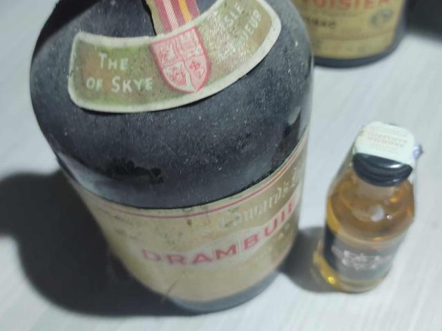 Това е бутилка съхранила духът и аромати на Ирландският ликьор Drambuie, направен по древна рецепта, датираща от 18-ти век, собственост на принц Чарлз Едуард Стюарт, и е разпространен за първи път на търговски пазари през 1909 г. За разлика от много други ликьори от уиски, Drambuie все още се произвежда. И затова сме добавили едно малко шишенце от съвременният вкус ценителите да могат да сравнят старото ...