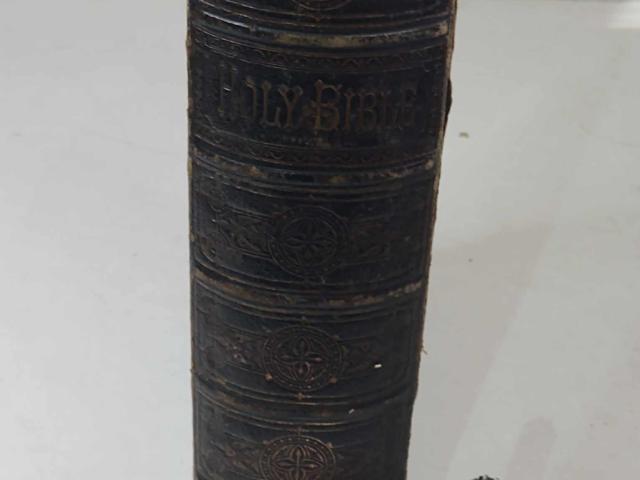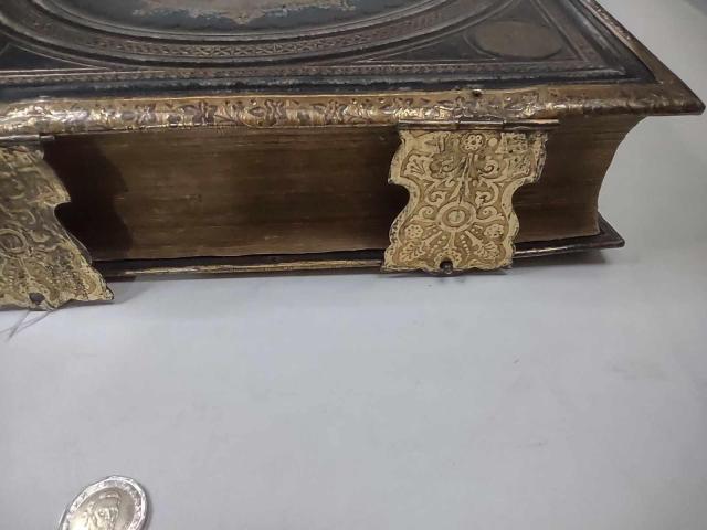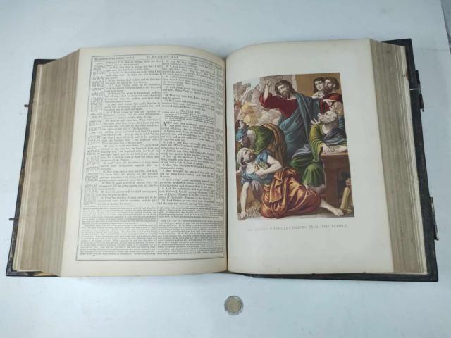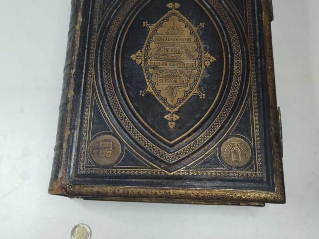 На Вашето внимание огромна Библия с кожени пресовани корици и месингов обков с позлата от около 1870-1875г. Публикувана за първи път през 1611 г., версията на Библията на крал Джеймс е оказала неизмеримо въздействие върху благочестието, езика и литературата в целия англоговорящ свят. Крал Джеймс II, последният католически крал на Англия управлява във време, в което страната трябва да направи решителен избор относно посоката на своето историческо развитие. През втората половина на XVII век в европейските държави има остри вътрешни противопоставяния между изразителите на различните управленски концепции. Джеймс, подобно на своя френски роднина Луи XIV, е представител на абсолютисткия модел, като неговите лични преживявания и текстове от тази библия играят съществена роля при оформянето на убежденията му.