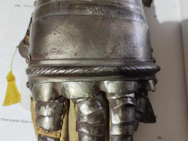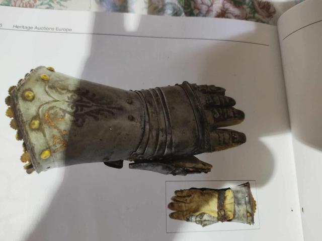 Ръкавицата е закупена от чужбина с гарантиран произход и документи. Автентична в много добро състояние за годините си. Излишно е да напомням, че над 99% от ръкавиците от този Рицарски период достигат до наши дни без кожената ръкавица, защото обикновено се разсъхват и разпадат ...