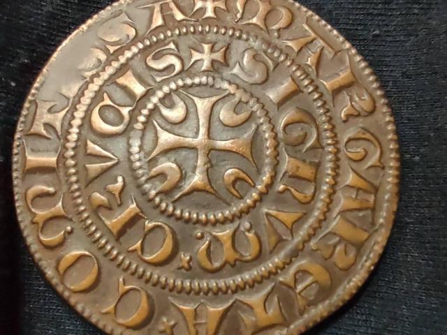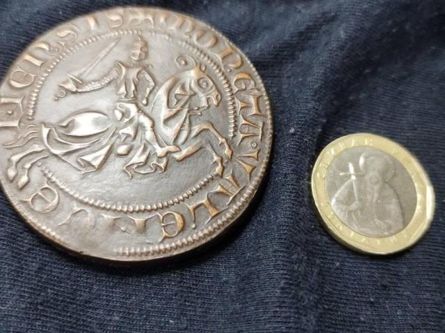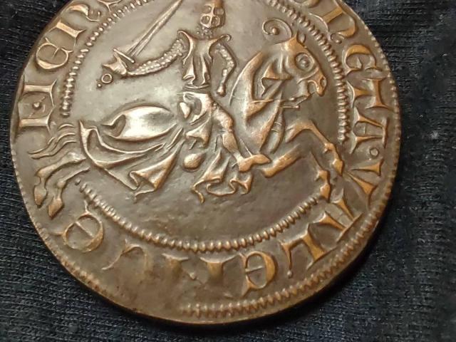 Уникален Медальон с Рицар тамплиер, който Язди надясно с вдигнат меч борещ се срещу Сарацините. Един от девизите на кръстоносците, Signum Crucis, също е украсявал монети, заедно с ръчния кръст, например на монетата на Маргарита от Константинопол. Изображения от 13-ти век на кръстоносец,, който взема кръста и атакува сарацин. Рицар на кон, яздещ НАДЯСНО, с изправен меч. Орнамент от навита перушина върх...