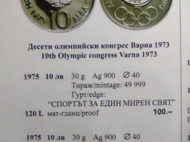 На Вашето внимание предлагаме монета от 1975г.с номинал 10 лева. Десети олимпийски конгрес Варна 1973 тираж 49 999 екземпляра от 49г. изчерпани от касите на БНБ