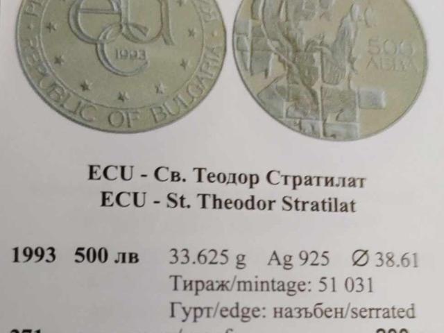 На Вашето внимание предлагаме монета от 1993г.с номинал 500 лева. Тодор Стратилат тираж 51 031 екземпляра от 29г. изчерпани от касите на БНБ