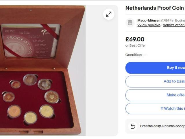 На Вашето внимание един интересен сет от 2004г. ПРУФ Нидерландия. Евро сет в оригинална луксозна кутия със сертификат лимитирана серия. Закупен от Англия през ebay.co.uk с всички платени митнически такси и данъци както и куриерски услуги. Монетите са на 20 години и са подходящи за подарък или инвестиция на която цената им ще расте. Сертифицирани такива сме виждали да се продават на по над 100 евро брой...