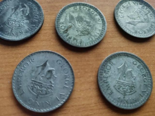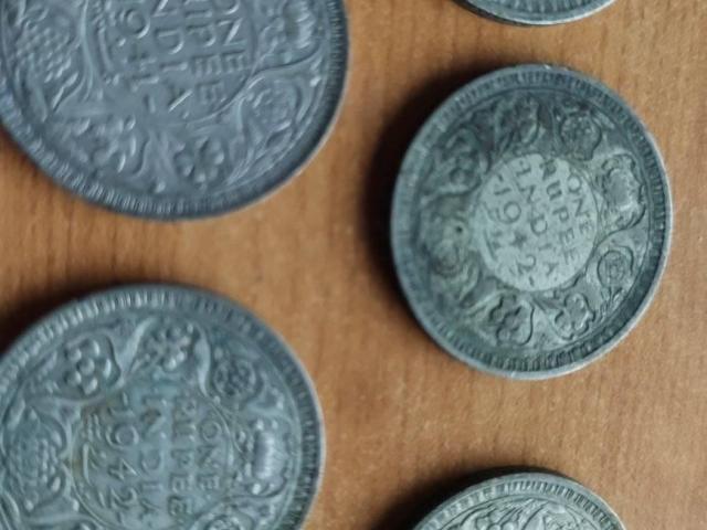 4 броя 1942 г. и 1 брой 1941 г. Индия - Британска Период Крал Джордж VI (1938 - 1947) Номинал 1 рупия Година 1942 Управник Джордж VI Метал Сребро 0.500 Тип на ръба Назъбен с бразда по дължината Форма Кръг Ориентация Медал (0°) Тегло (g) 11.66 Диаметър (mm) 30.5 Дебелина (mm) 2 Монетите не са почиствани. Цена 100лв. Припомняме, че всеки който закупи артикули на стойност над 100лв. ще получи оригинален химикал с надпис HERITAGE AUCTIONS EUROP...