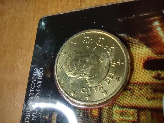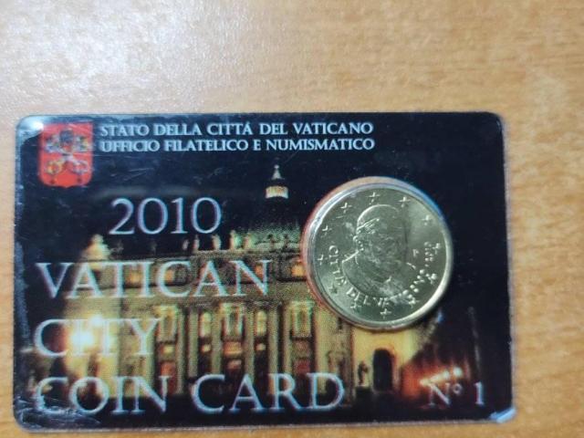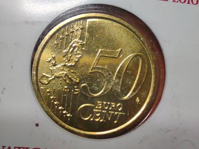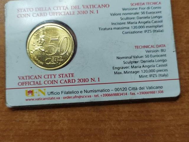 Тип : Монета-карта 50 цента BENOÎT XVI (n°1) Дата: 2010 г Име на монетния двор / Град: Рома Изсечено количество: 120 000 Метал: скандинавско злато Диаметър : 24,25 мм Ориентационни матрици: 12 часа. Тегло : 7,80 гр. Ръб: Големи канали Официален блистер, съдържащ 50 цента от 2010 г. на изображението на папата Беноа XVI. Лот:80а монета Ватикана е на цена от 30лв.